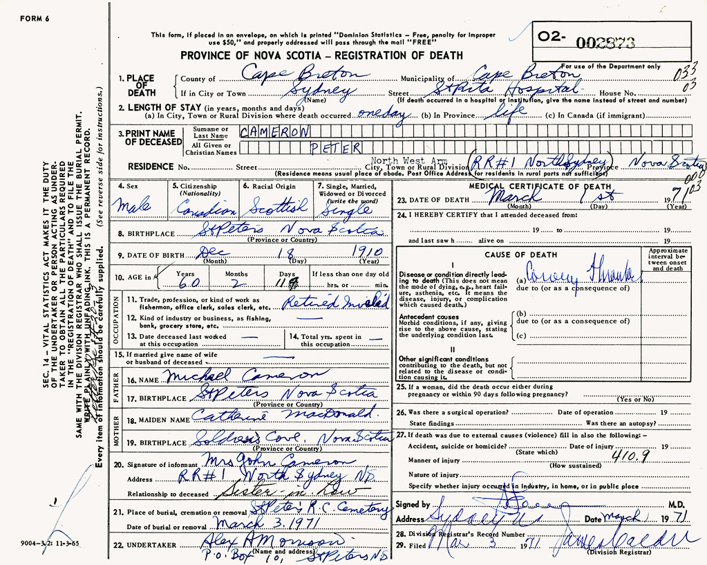 1. PLACE OF DEATH County of Cape Breton If in City or Town Sydney