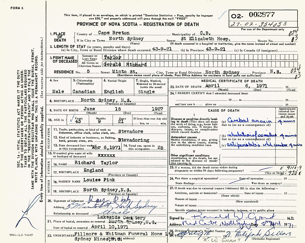 PROVINCE OF NOVA SCOTIA — REGISTRATION OF DEATH