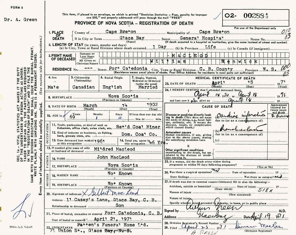 1. PLACE OF DEATH County of Cape Breton If in City or Town Glace Bay