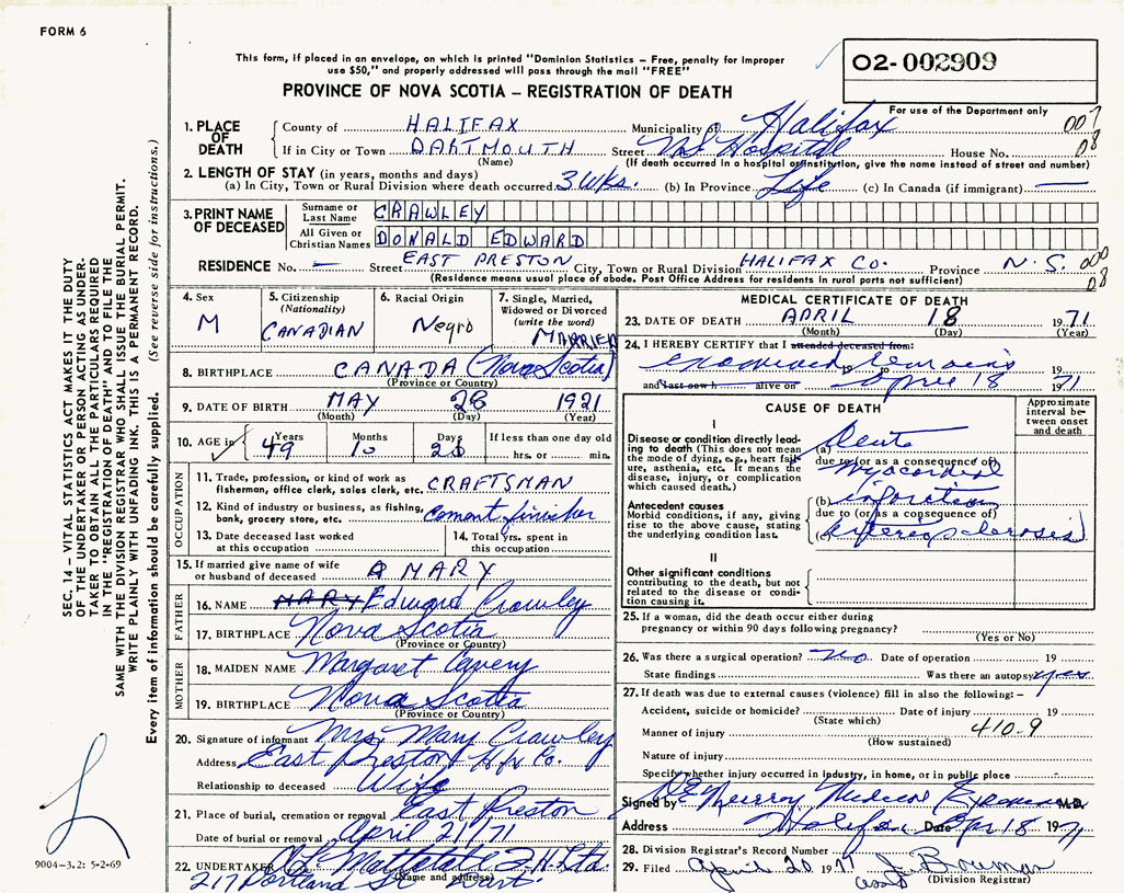 PROVINCE OF NOVA SCOTIA — REGISTRATION OF DEATH