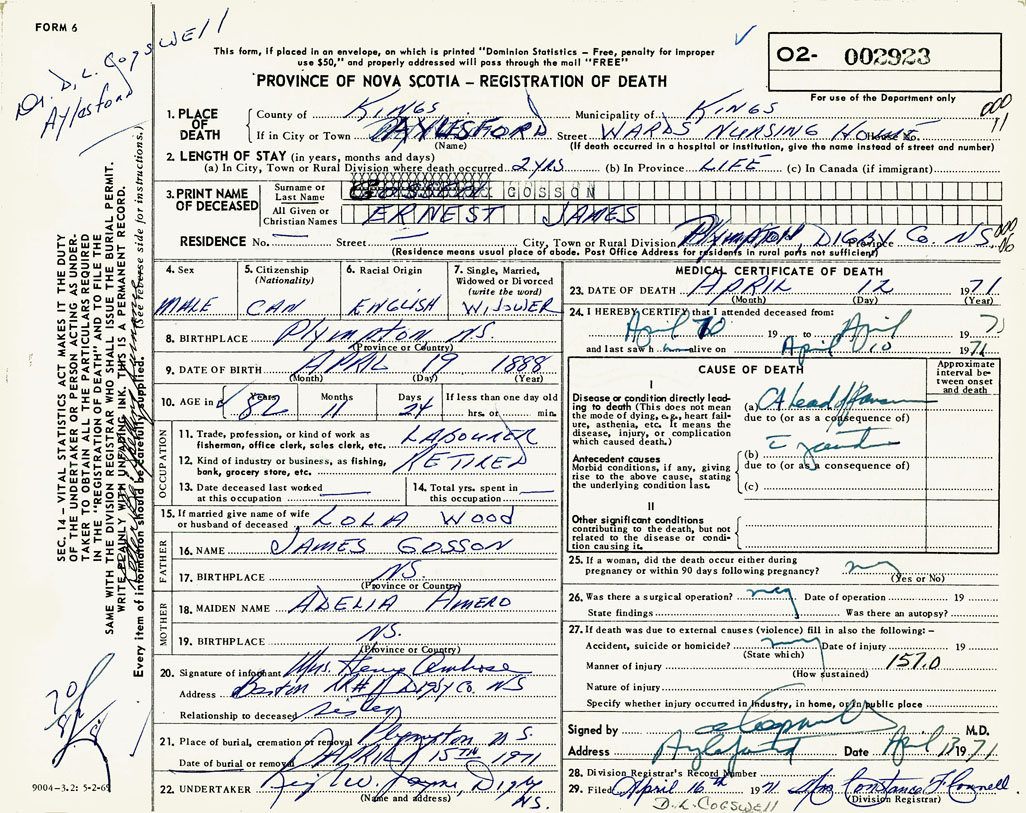 PROVINCE OF NOVA SCOTIA — REGISTRATION OF DEATH