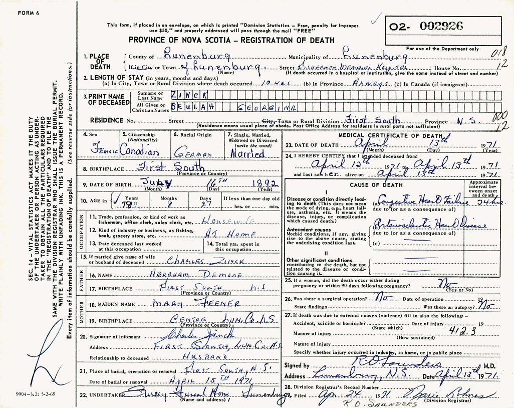 PROVINCE OF NOVA SCOTIA — REGISTRATION OF DEATH