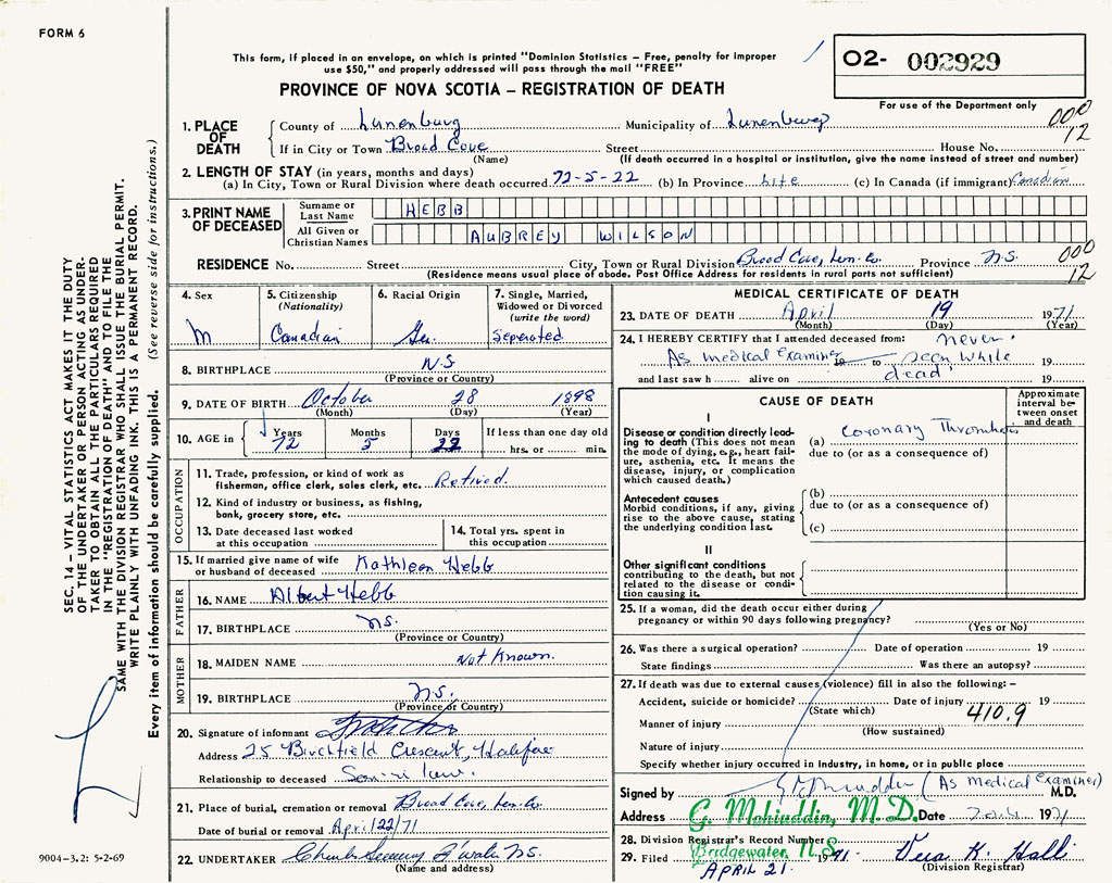 PROVINCE OF NOVA SCOTIA — REGISTRATION OF DEATH