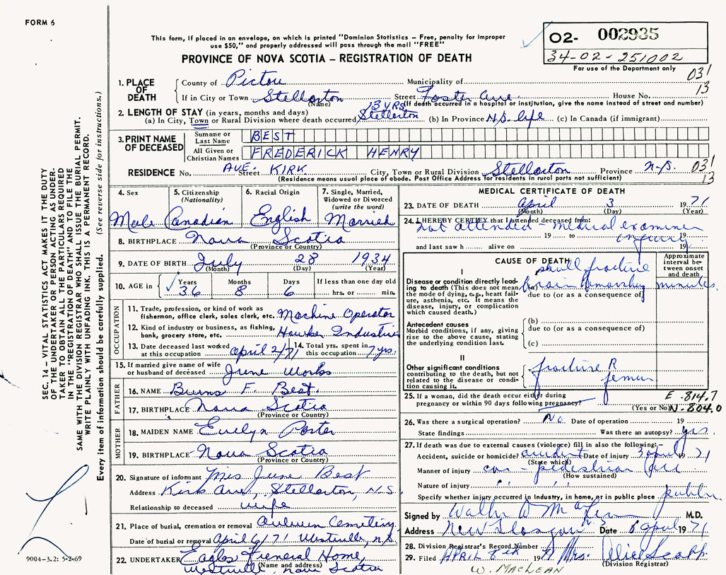 PROVINCE OF NOVA SCOTIA — REGISTRATION OF DEATH
