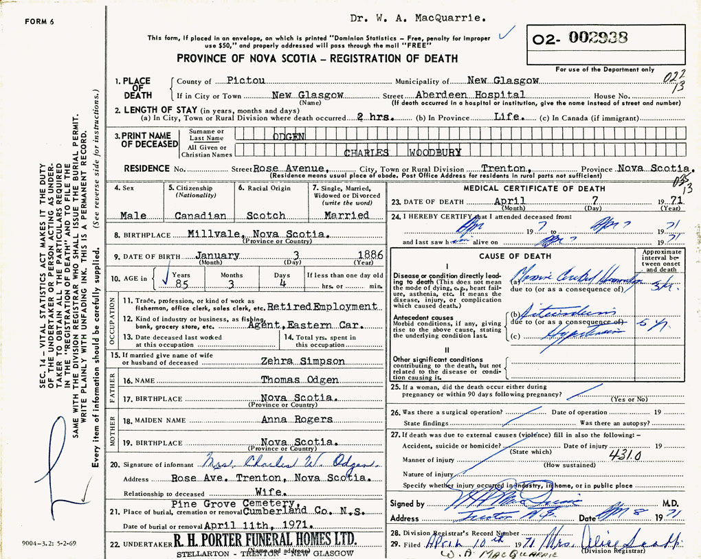 PROVINCE OF NOVA SCOTIA — REGISTRATION OF DEATH