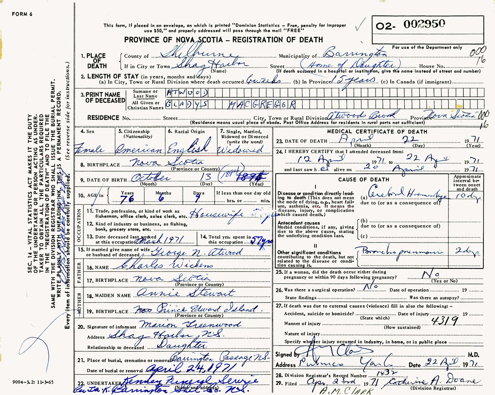 PROVINCE OF NOVA SCOTIA — REGISTRATION OF DEATH