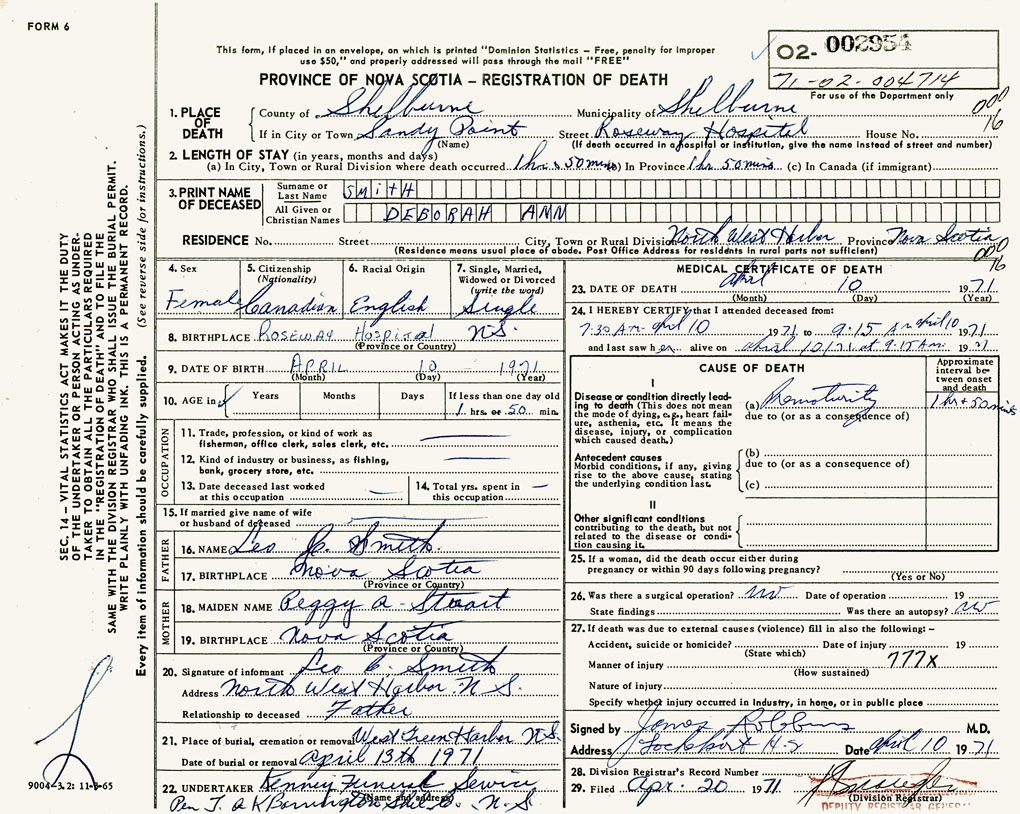 1. PLACE OF DEATH County of Shelburne If in City or Town Sandy Point