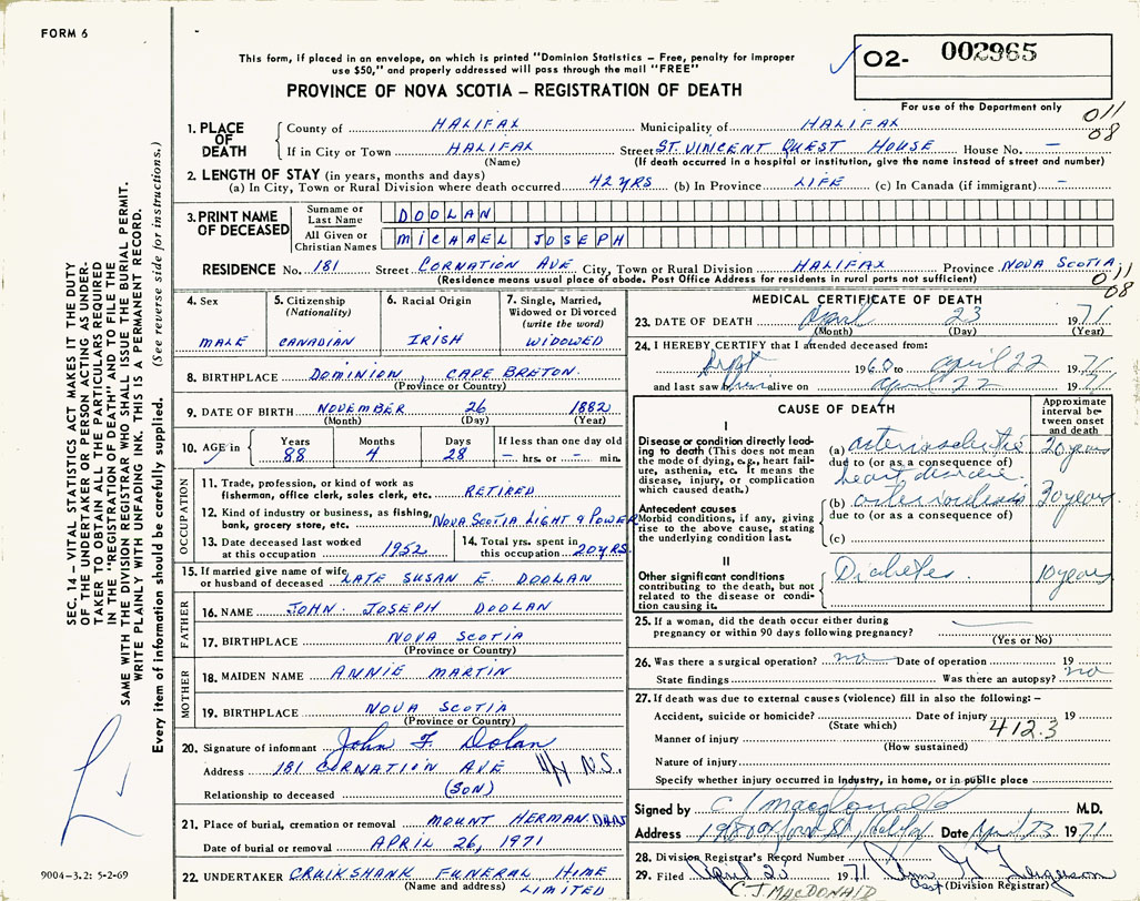 PROVINCE OF NOVA SCOTIA — REGISTRATION OF DEATH
