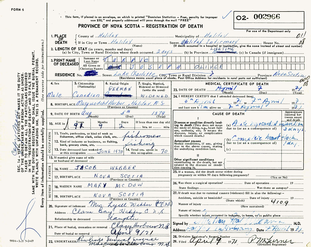 PROVINCE OF NOVA SCOTIA — REGISTRATION OF DEATH