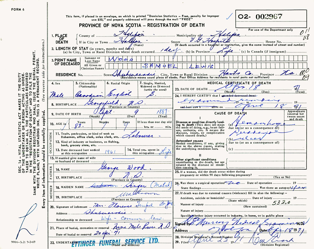 PROVINCE OF NOVA SCOTIA — REGISTRATION OF DEATH