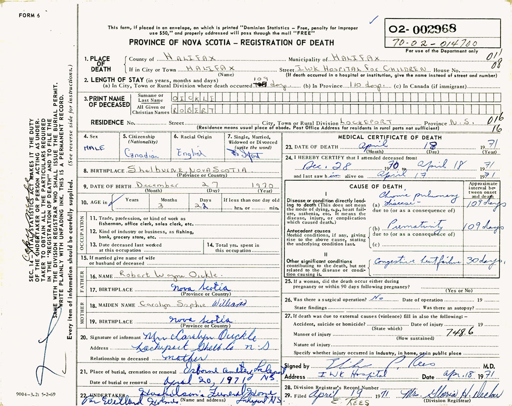 PROVINCE OF NOVA SCOTIA — REGISTRATION OF DEATH