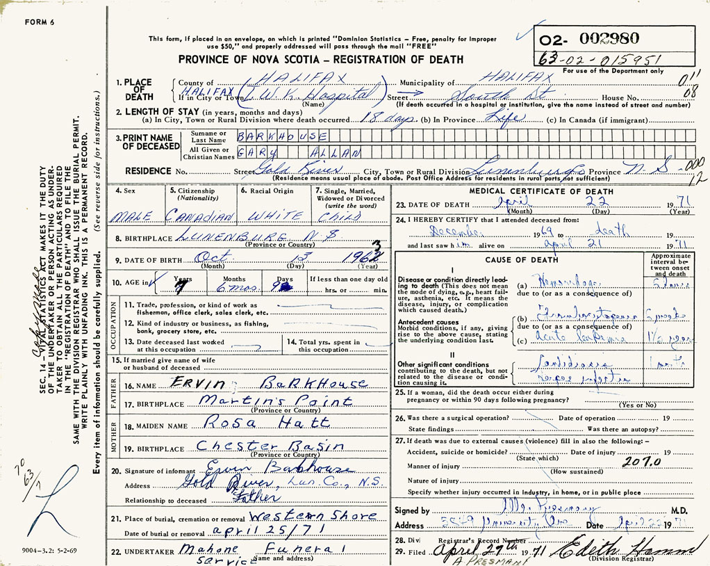 PROVINCE OF NOVA SCOTIA — REGISTRATION OF DEATH