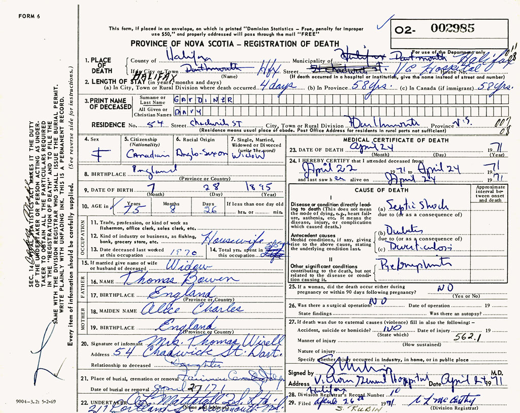 PROVINCE OF NOVA SCOTIA — REGISTRATION OF DEATH