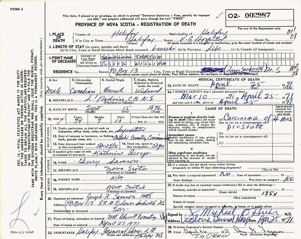 PROVINCE OF NOVA SCOTIA — REGISTRATION OF DEATH