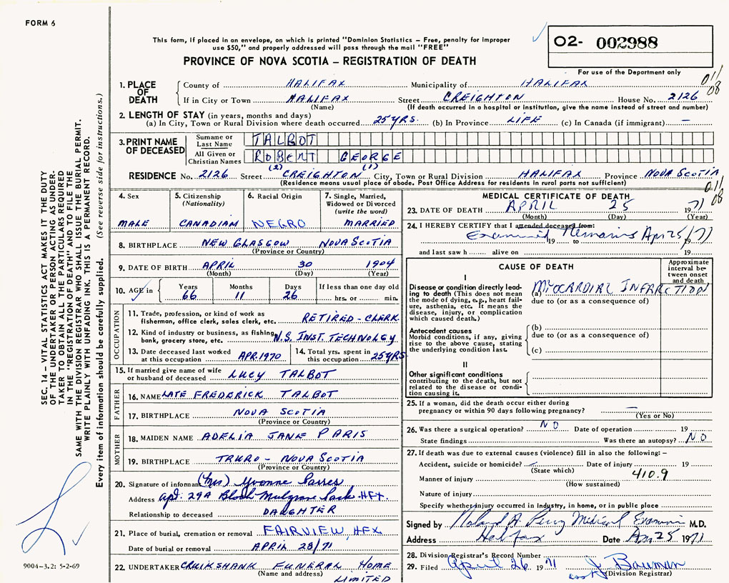 PROVINCE OF NOVA SCOTIA — REGISTRATION OF DEATH
