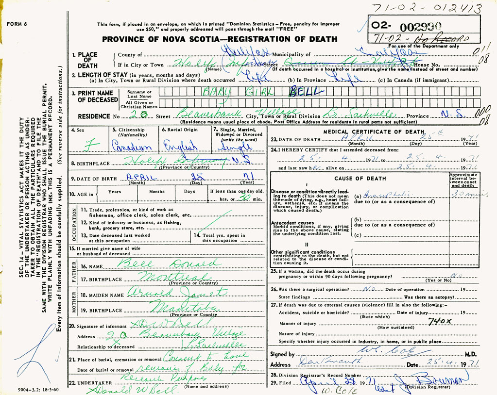 PROVINCE OF NOVA SCOTIA — REGISTRATION OF DEATH