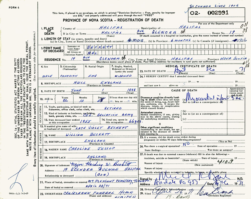 PROVINCE OF NOVA SCOTIA — REGISTRATION OF DEATH