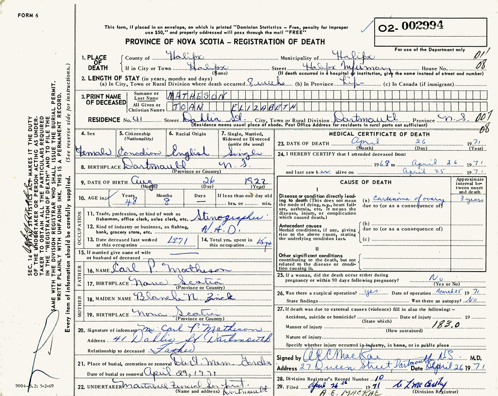 PROVINCE OF NOVA SCOTIA — REGISTRATION OF DEATH