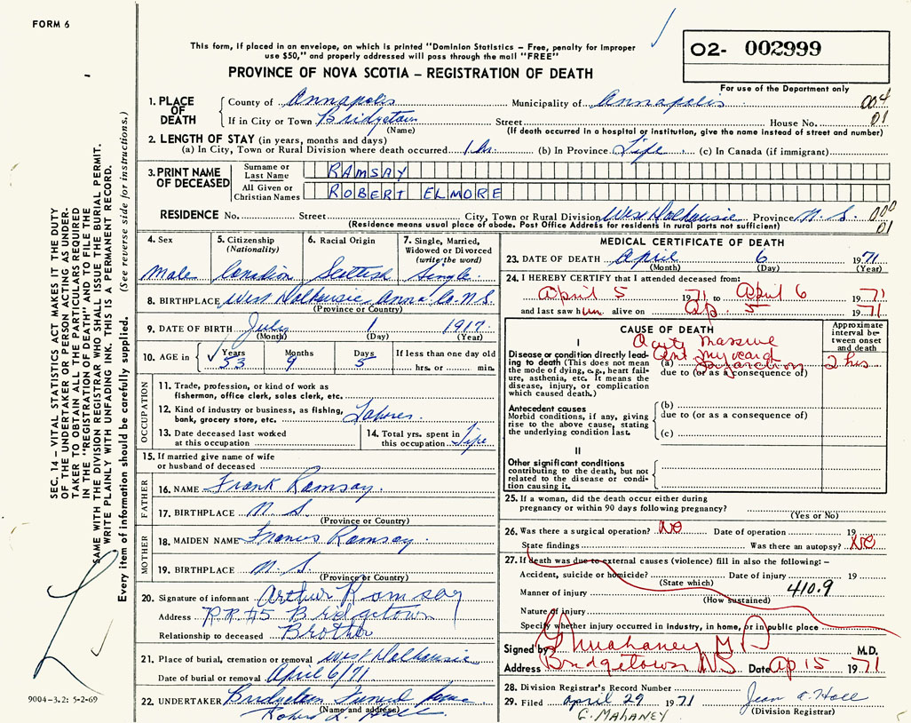 PROVINCE OF NOVA SCOTIA — REGISTRATION OF DEATH