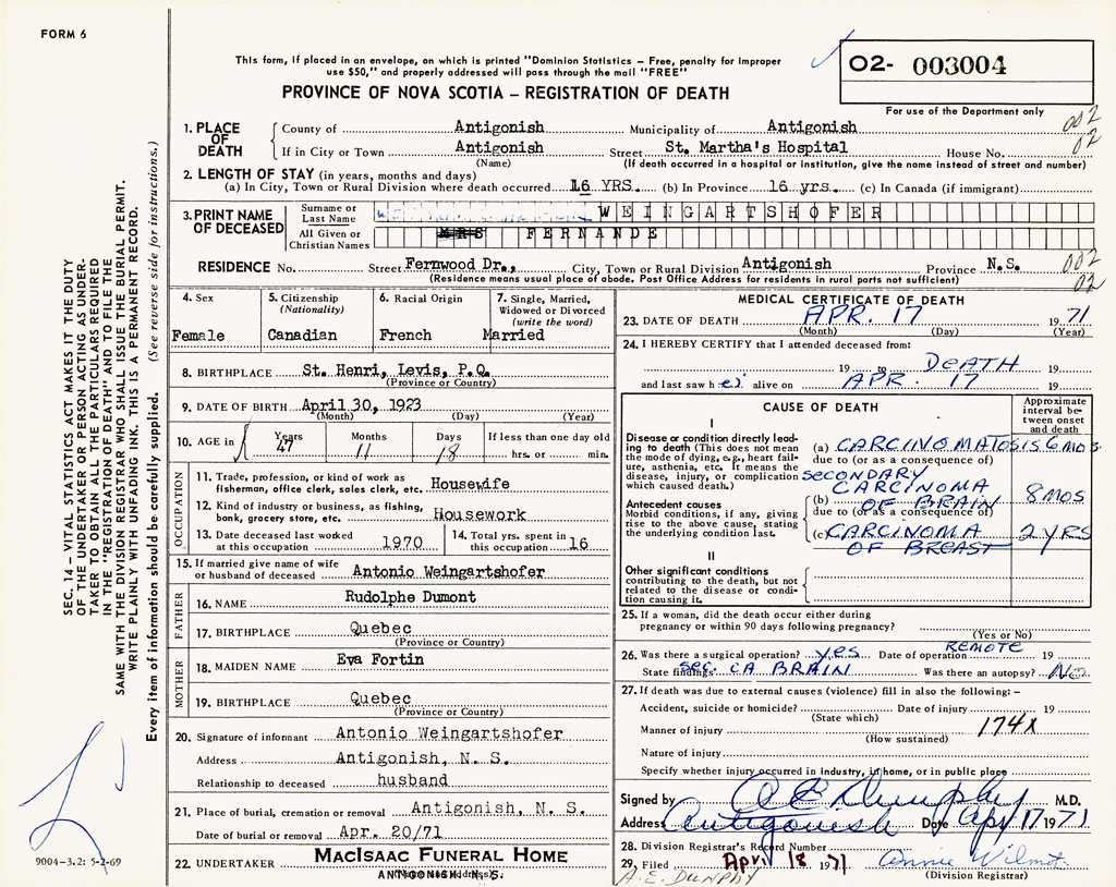 1. PLACE OF DEATH County of Antigonish If in City or Town Antigonish