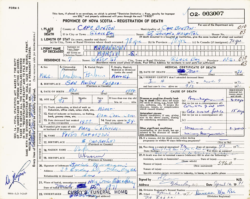 1. PLACE OF DEATH County of Cape Breton If in City or Town Glace Bay