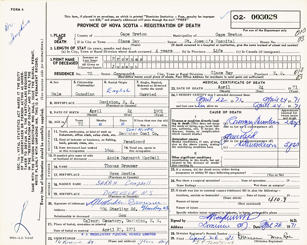 1. PLACE OF DEATH County of Cape Breton If in City or Town Glace Bay