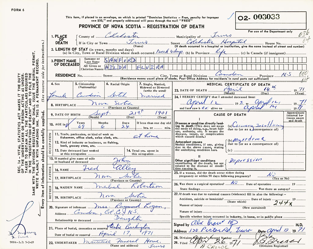 PROVINCE OF NOVA SCOTIA — REGISTRATION OF DEATH