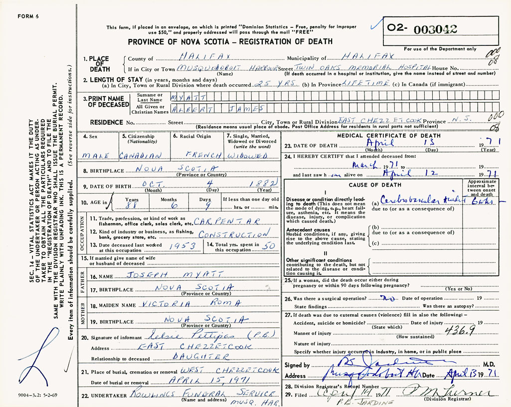 PROVINCE OF NOVA SCOTIA — REGISTRATION OF DEATH