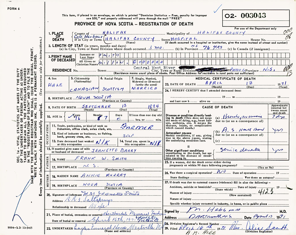 PROVINCE OF NOVA SCOTIA — REGISTRATION OF DEATH