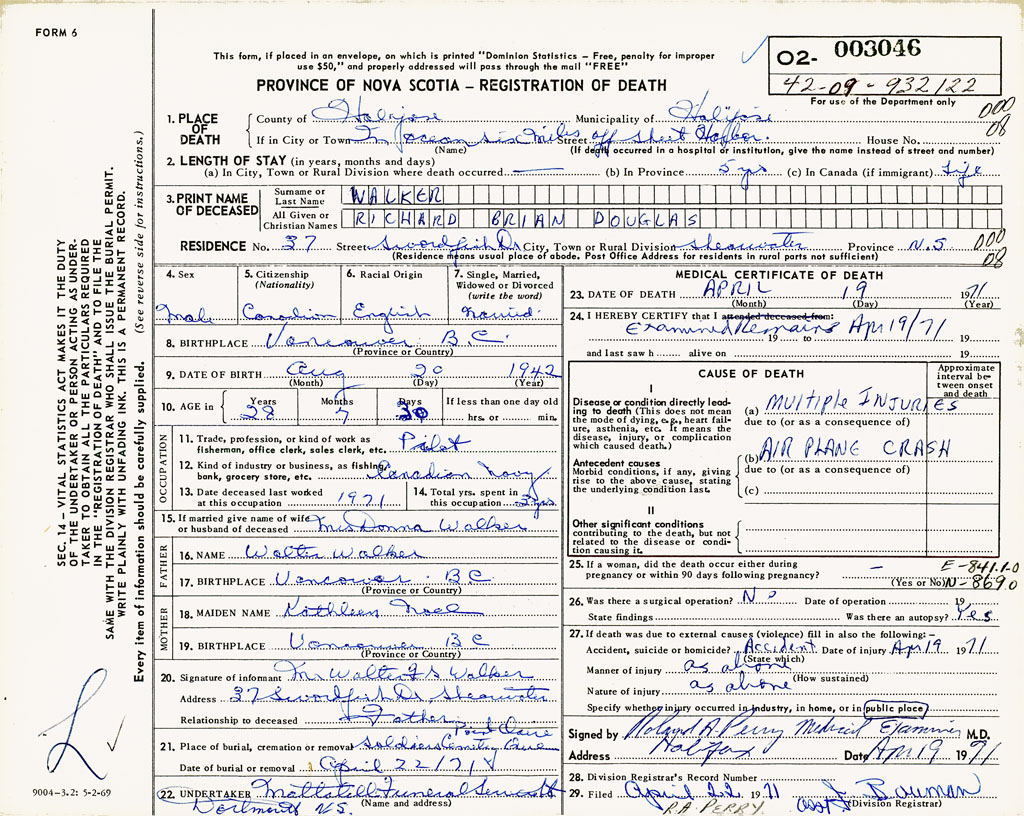 PROVINCE OF NOVA SCOTIA — REGISTRATION OF DEATH