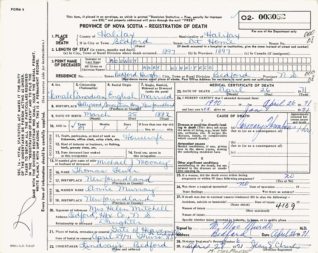 PROVINCE OF NOVA SCOTIA — REGISTRATION OF DEATH