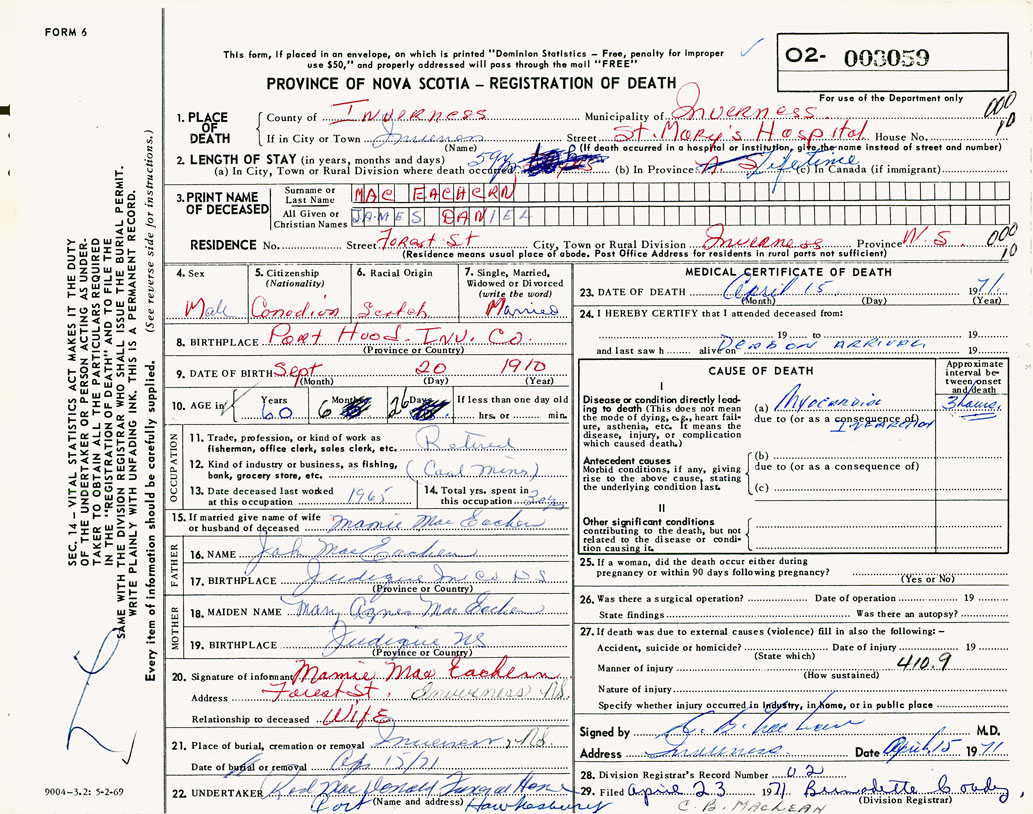 PROVINCE OF NOVA SCOTIA — REGISTRATION OF DEATH