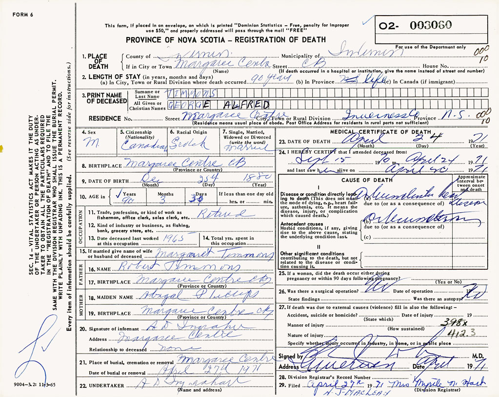 PROVINCE OF NOVA SCOTIA — REGISTRATION OF DEATH