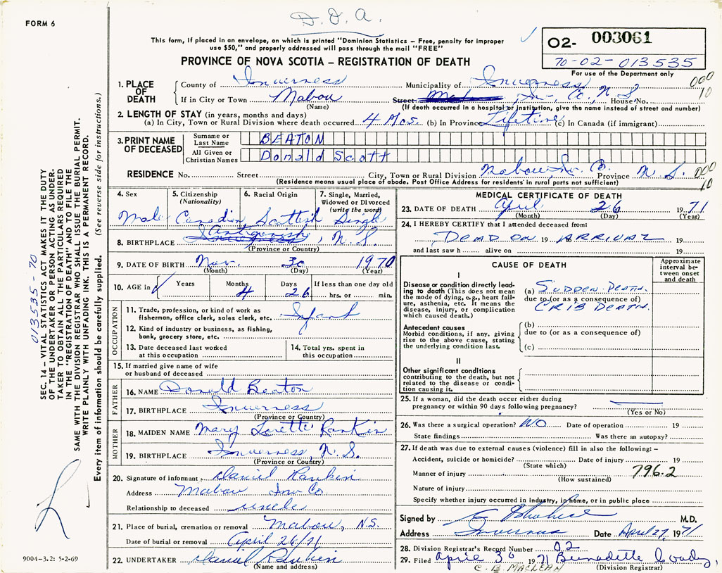 PROVINCE OF NOVA SCOTIA — REGISTRATION OF DEATH