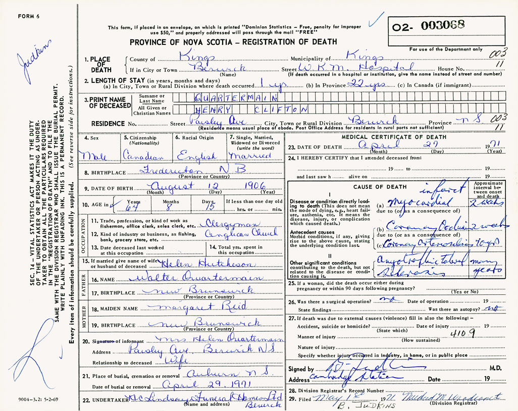 PROVINCE OF NOVA SCOTIA — REGISTRATION OF DEATH