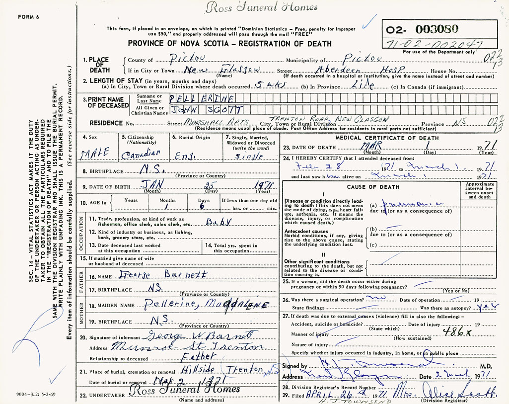 1. PLACE OF DEATH County of Pictou If in City or Town New Glasgow