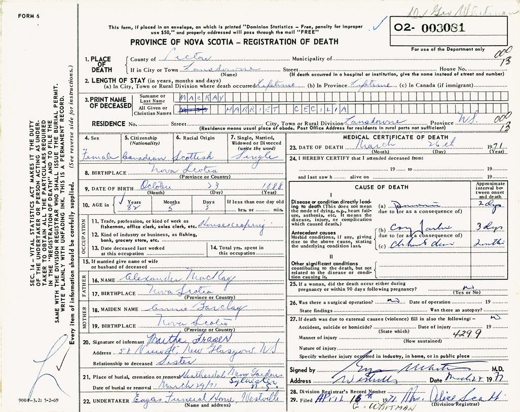 PROVINCE OF NOVA SCOTIA — REGISTRATION OF DEATH