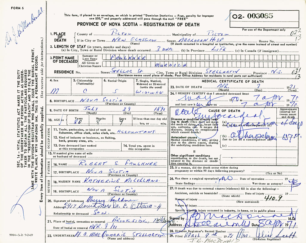 PROVINCE OF NOVA SCOTIA — REGISTRATION OF DEATH