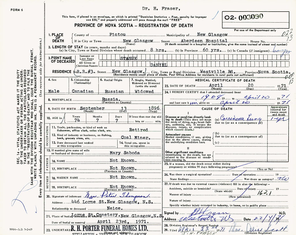 PROVINCE OF NOVA SCOTIA — REGISTRATION OF DEATH