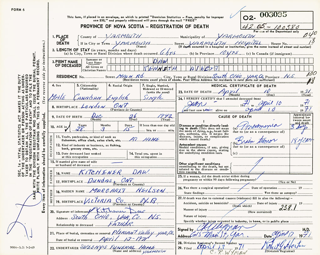 PROVINCE OF NOVA SCOTIA — REGISTRATION OF DEATH