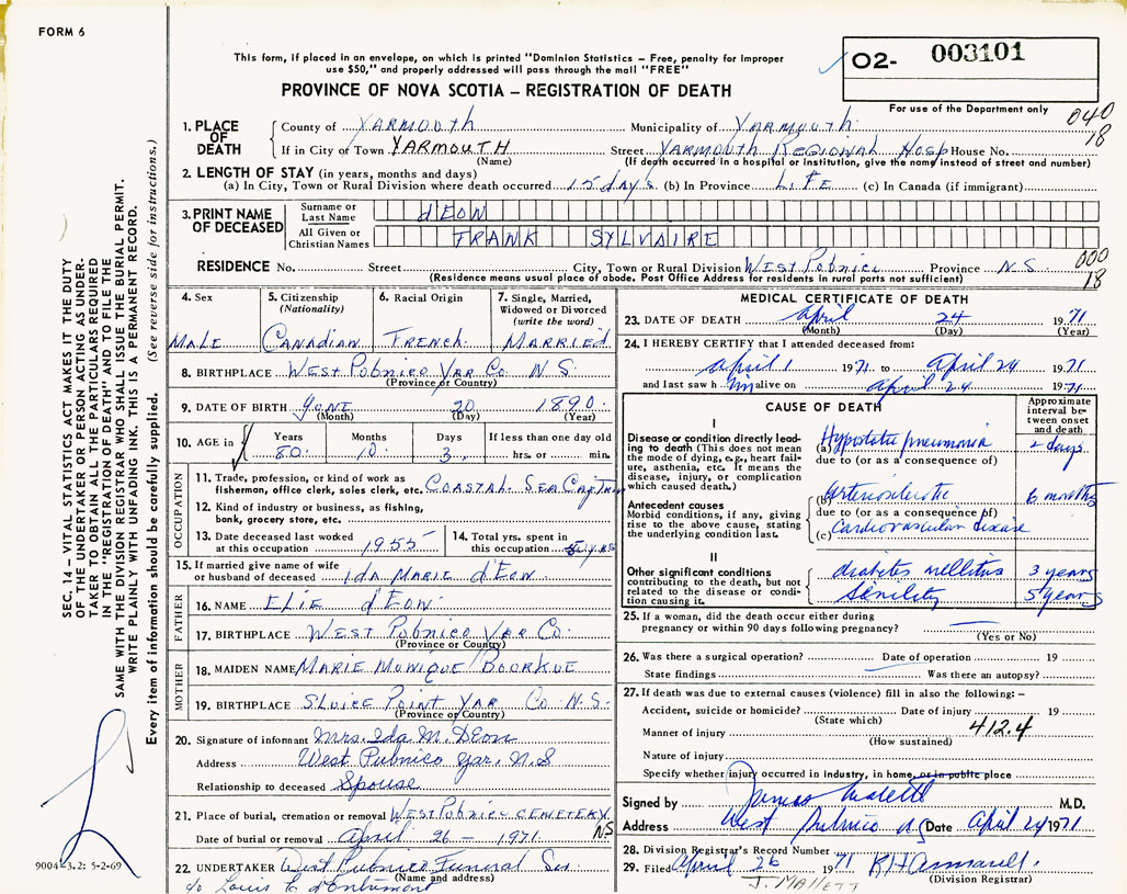 PROVINCE OF NOVA SCOTIA — REGISTRATION OF DEATH