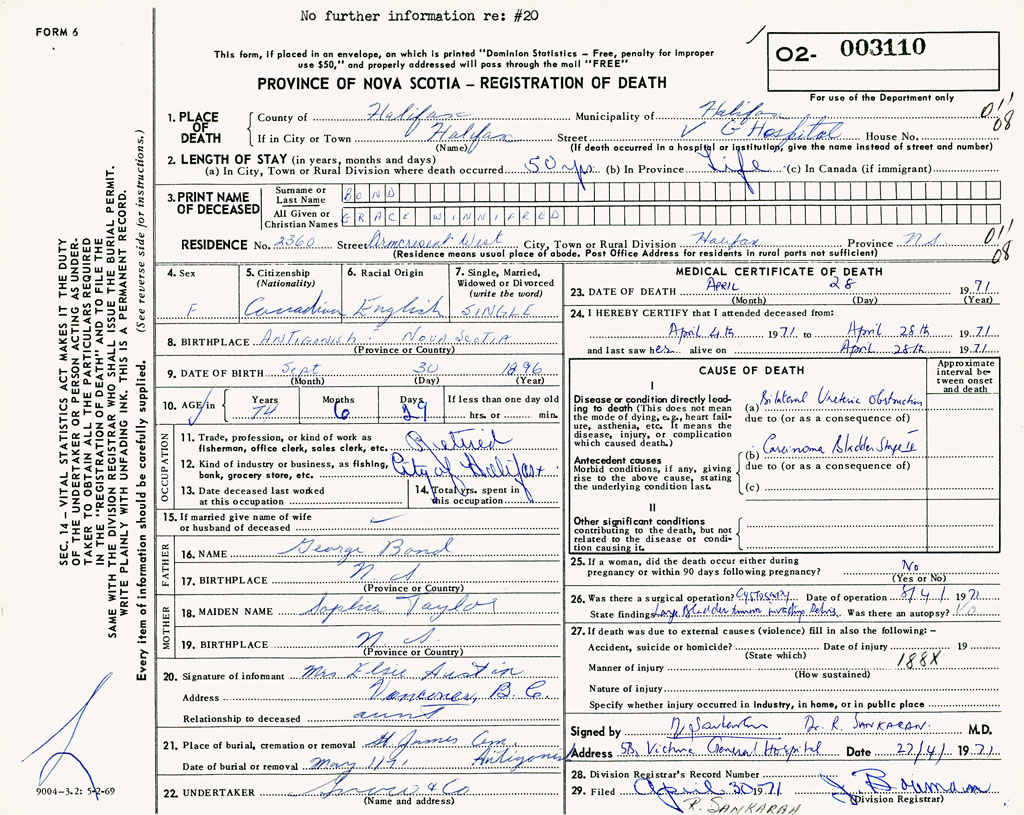 PROVINCE OF NOVA SCOTIA — REGISTRATION OF DEATH