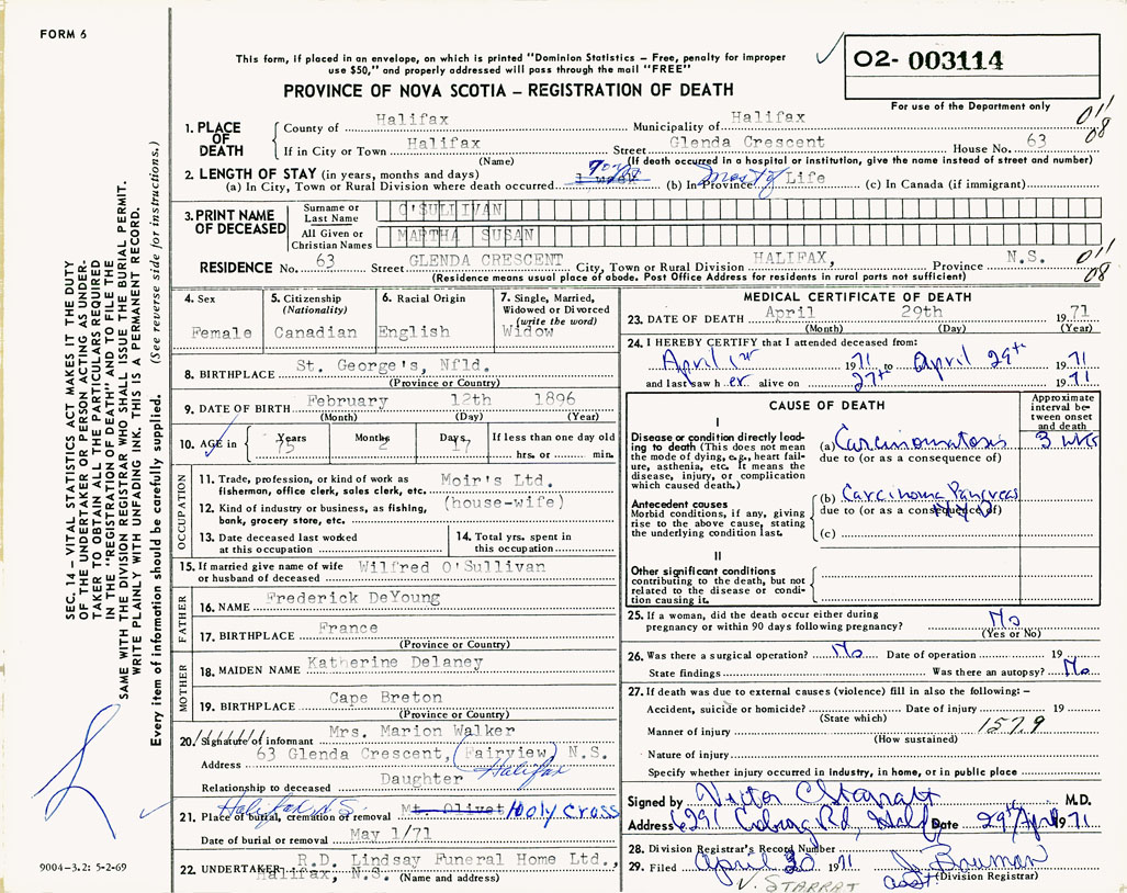 21. Place of burial Holy Cross, Halifax, NS