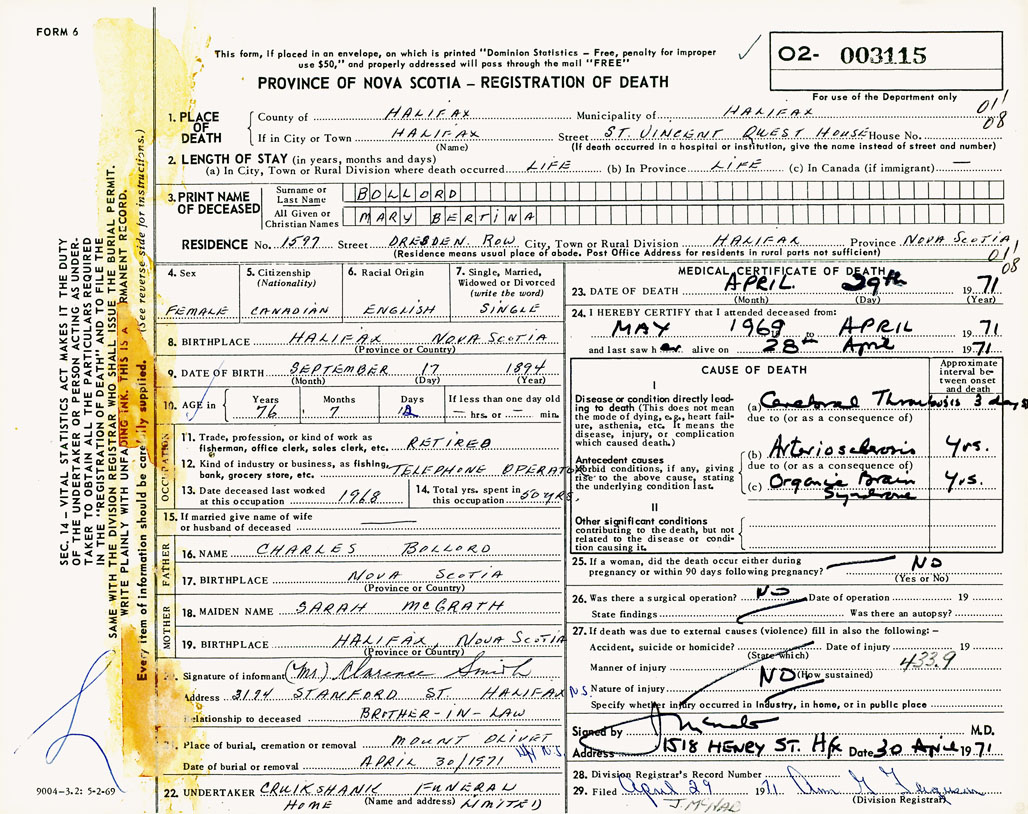 PROVINCE OF NOVA SCOTIA — REGISTRATION OF DEATH