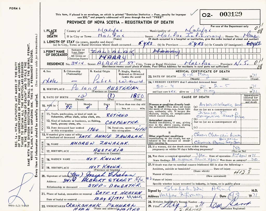 3. PRINT NAME OF DECEASED Zawalak, Harry