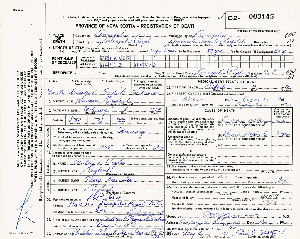 1. PLACE OF DEATH County of Annapolis If in City or Town Annapolis Royal