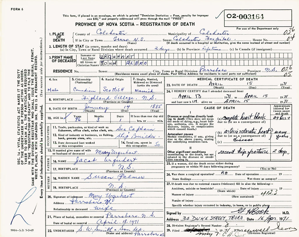 PROVINCE OF NOVA SCOTIA — REGISTRATION OF DEATH