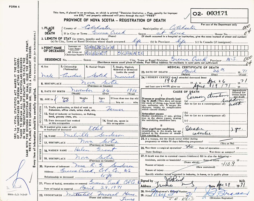 PROVINCE OF NOVA SCOTIA — REGISTRATION OF DEATH