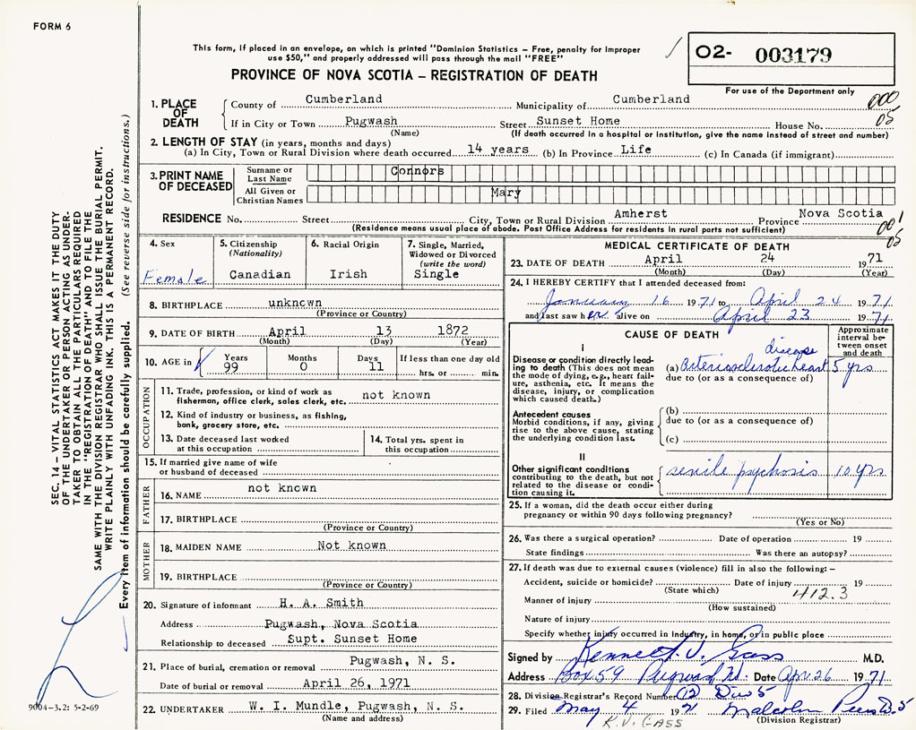 1. PLACE OF DEATH County of Cumberland If in City or Town Pugwash