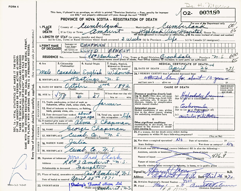 PROVINCE OF NOVA SCOTIA — REGISTRATION OF DEATH